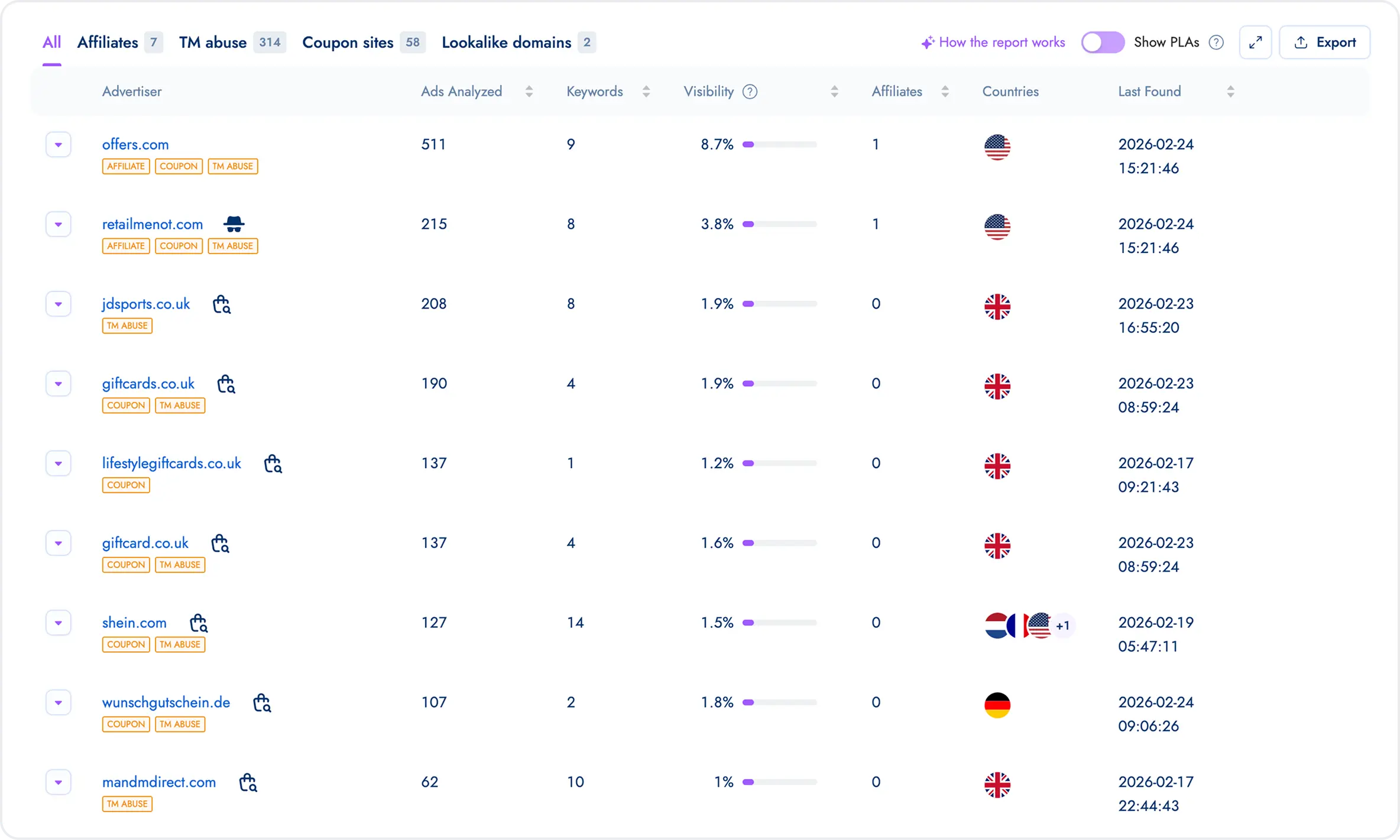 Identify partners bidding on branded keywords and verify that affiliate traffic follows program rules.